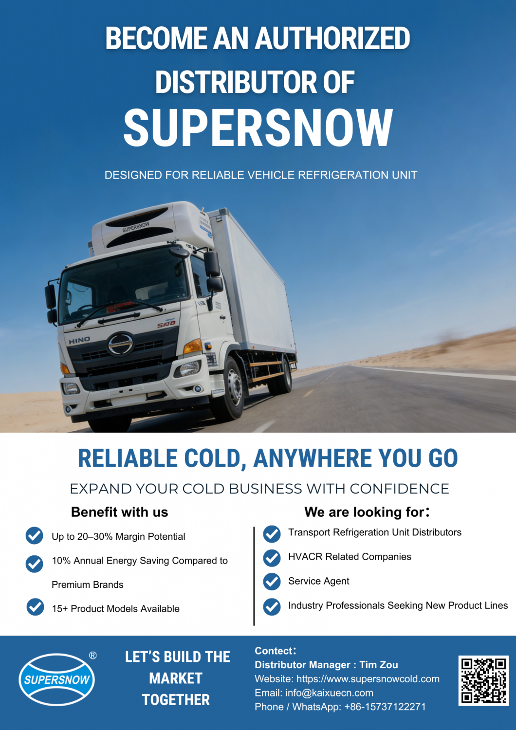 Pozisyon: SUPERSNOW Transport Refrigeration – Küresel Bölgesel Distribütör / Stratejik OrtakŞirket: SUPERSNOW (Zhengzhou Kaixue Transport Soğutma Ekipmanları Co., Ltd.) Temel Ürünler:Nakliye Soğutma Ekipmanları, Soğutmalı Kamyon Soğutma Üniteleri, Tamamen Elektrikli Soğutma Üniteleri, Treyler Soğutma Üniteleri |